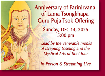 In honor of the anniversary of the passing away of Lama Je-Tsong Khapa, the venerable monks of Drepung Loseling and the Mystical Arts of Tibet tour will lead a Guru Puja Tsok Offering.