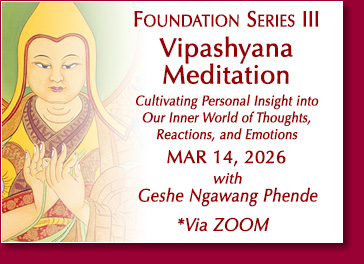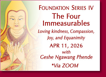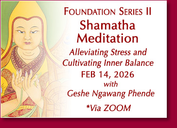 | Geshe Ngawang Phende will lead the Foundation Series begining with an introduction to Buddhism and continuing with retreats on the four universal Buddhist meditation practices. |